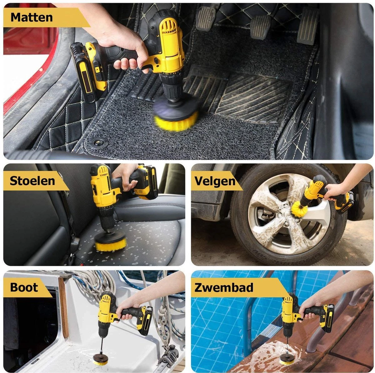 Met de drie verschillende borstels kunt u uw badkamer, bekleding, vloer, tapijt, douche, badkamer, toilet reinigen. De Nylon borstels zullen de oppervlakken niet beschadigen. Door de verlengde borstels kunt u makkelijk plekken bereiken die normaal lastig te bereiken zijn. Denk bijvoorbeeld aan pannen, het fornuis, de auto, enz.