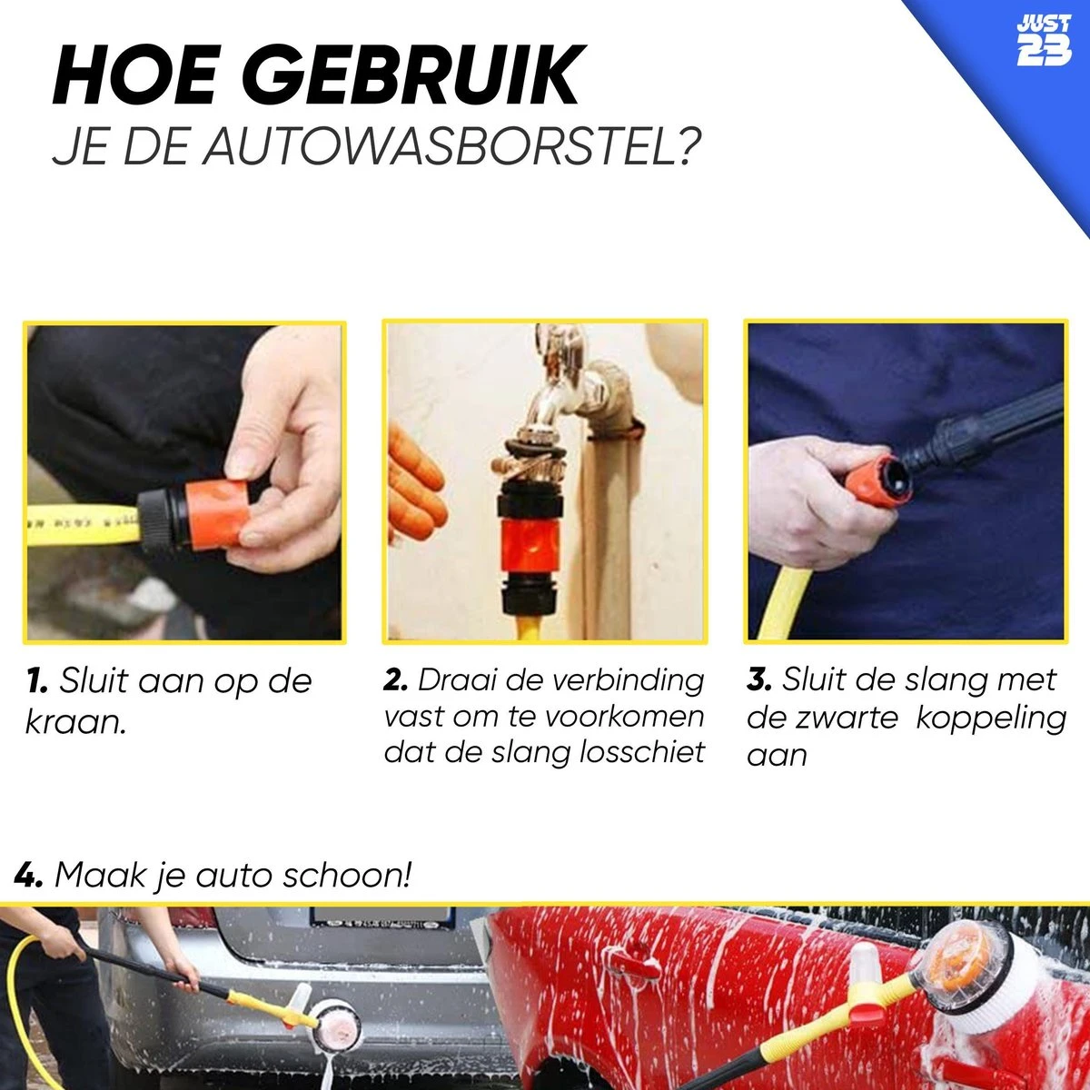 De roterende autowasborstel van JUST23 is zeer eenvoudig in gebruik. Je sluit de tuinslang aan op de kraan en draait hem goed vast zodat hij niet losschiet. Vervolgens sluit je de autowasborstel aan op de andere kant van de tuinslang. Stel de waterregelaar in op de gewenste stand en je kunt de borstel nu gebruiken!