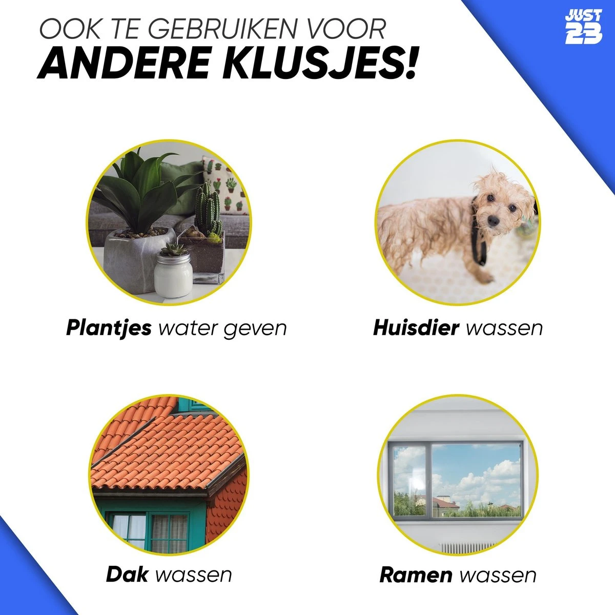 Een reguliere schoonmaakdoek of spons maakt vaak niet alles goed schoon. Ook kun je erg last van je rug krijgen omdat je veel moet bukken. De roterende wasborstel van JUST23 lost al deze problemen op. De borstel van JUST23 zorgt voor de meest comfortabele poetservaring mogelijk!