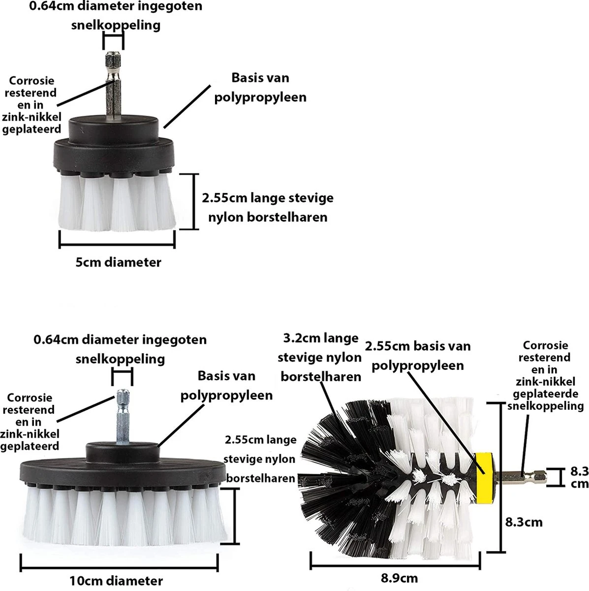 De Witte Zachte 3-delige borstelset voor boormachine kan in binnenhoeken en wielspaken reiken.