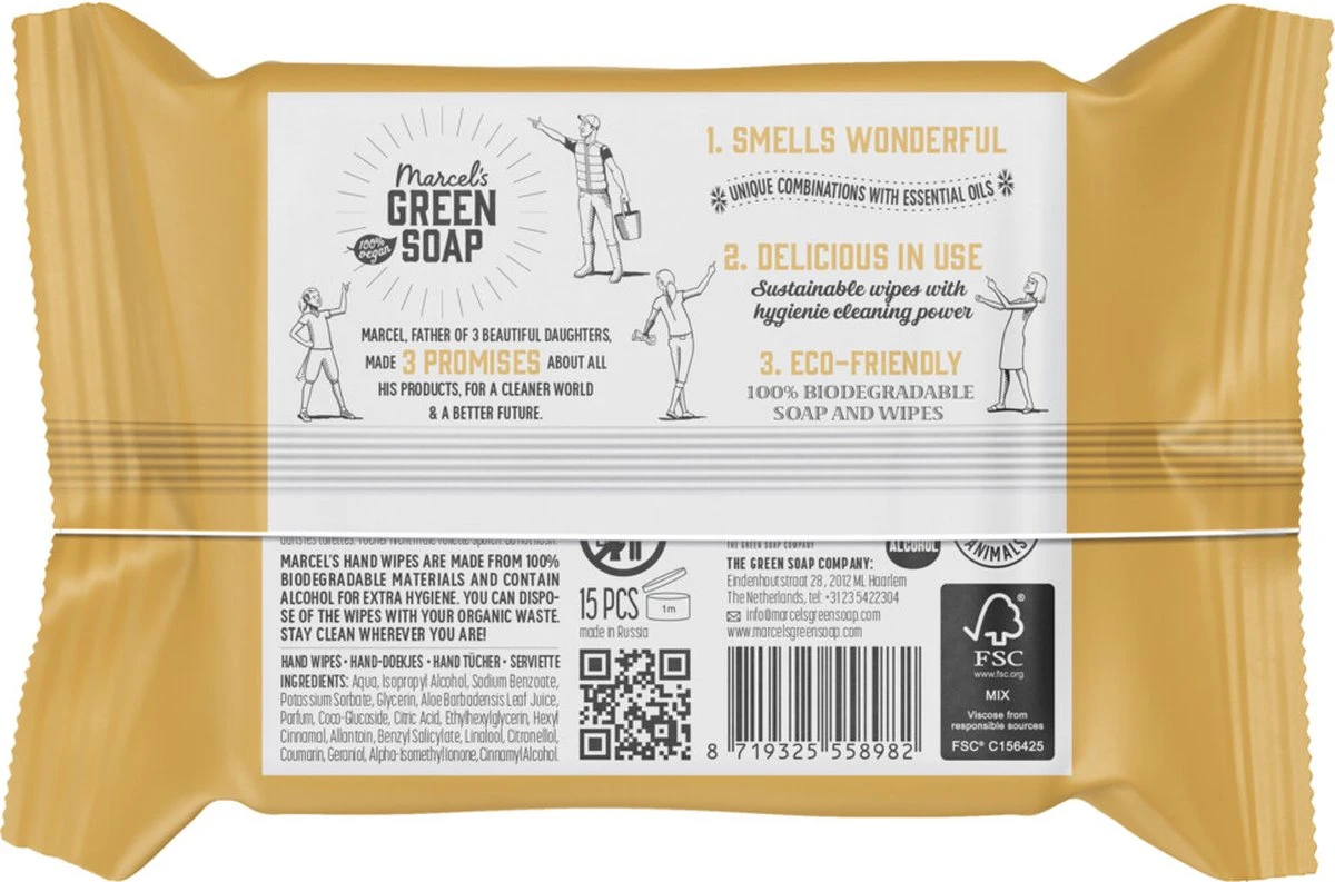 De hygiënische hand doekjes van marcel’s green soap maken niet alleen jouw handen schoon, ze houden ook onze planeet lekker schoon! gemaakt van 100% biologisch afbreekbare plantaardige vezels én makkelijk mee te nemen zodat je op elk moment je handen kunt reinigen. In elk pak zitten 15 doekjes. Geen plastic, maar planten marcel’s hygiënische hand doekjes zijn gemaakt van viscose. Viscose is materiaal, bestaande uit plantaardige vezels gemaakt van planten en houtpulp. Dat is waarom hygiënische doekjes op basis van viscose vezels op natuurlijke wijze afgebroken kunnen worden. De samenstelling van onze viscose bevat zo’n 50% eucalyptus en 50% acacia.â pure plantpower dus! zacht voor je huid en de planeet onze hygiënische hand doekjes zijn net als de schoonmaak doekjes gemaakt van 99% natuurlijke ingrediënten, met 100% biologische oliën en ze zijn 100% biologisch afbreekbaar. De doekjes bevatten alcohol voor extra hygiëne en zijn lekker zacht voor je huid door de toegevoegde glycerine en aloë vera. Naspoelen is niet nodig. Klaar met schoonmaken? dan gooi je ze in de prullenbak. De hygiënische doekjes lossen namelijk niet snel genoeg op om geen overlast in de natuur of een verstopping in het riool te voorkomen. Better safe than sorry! vanille & kersenbloesem kersenbloesem staat symbool voor het begin van de lente, voor vernieuwing. En dat is precies wat deze geur doet: je zó fris laten voelen dat je als nieuw bent! als kers op de taart hebben we er vanille aan toegevoegd voor het rustgevende gevoel. Zo heb jij het hele jaar door de lente in je bol!