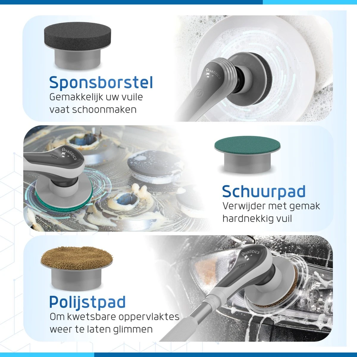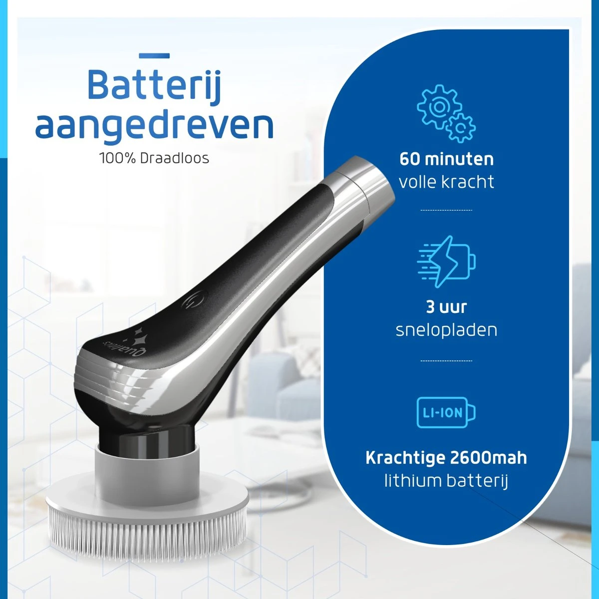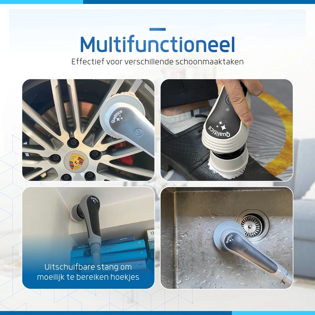 Op zoek naar een snelle, effectieve en klachtenloze manier om grondig schoon te maken? Ontmoet dan nu de vernieuwde elektrische schoonmaakborstel van Qualitics! Dankzij de Spin & Scrub technologie, de 10 verschillende opzetstukjes en de telescopische uitschuifbare stang is deze schoonmaakborstel de multifunctionele oplossing voor alle problemen rondom het huishoudelijk schoonmaken. Het schoonmaken van uw keuken, badkamer, woonkamer en zelfs uw schoenen en auto is hierdoor nog nooit zo makkelijk geweest!