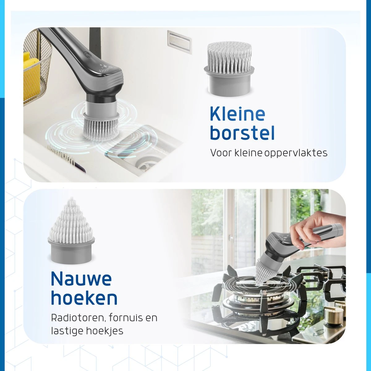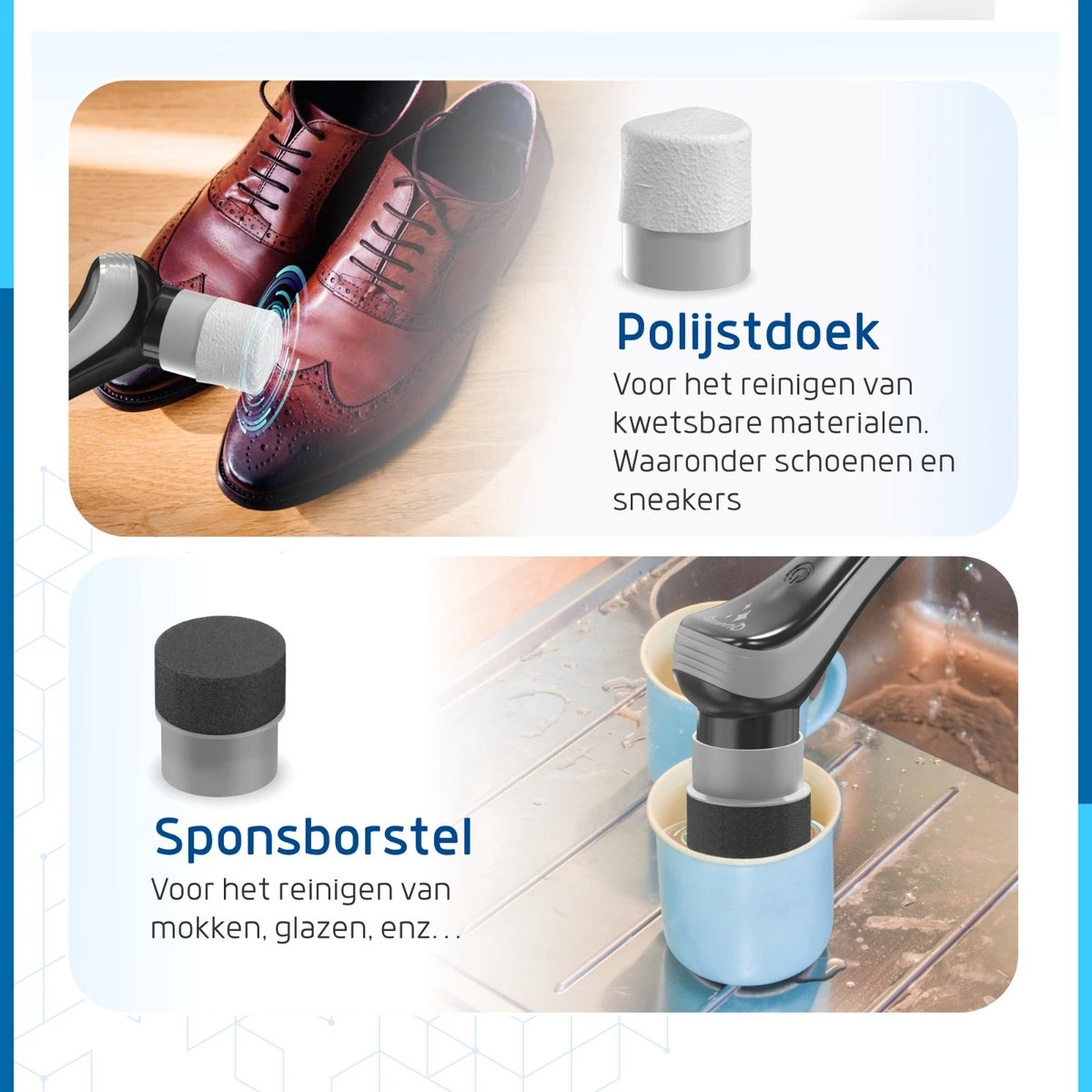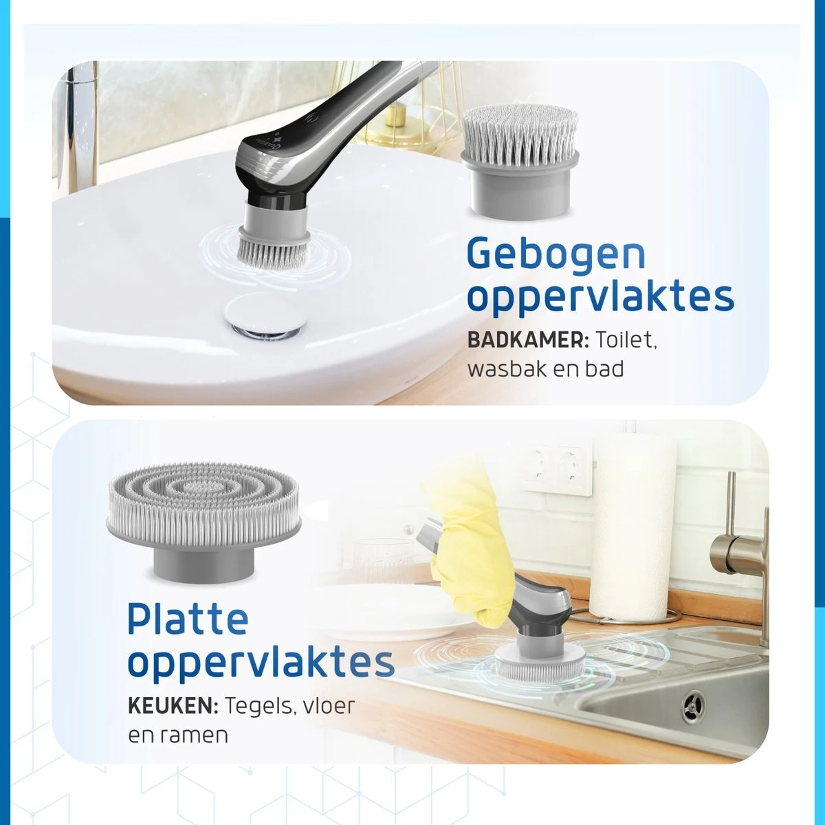 Op zoek naar een snelle, effectieve en klachtenloze manier om grondig schoon te maken? Ontmoet dan nu de vernieuwde elektrische schoonmaakborstel van Qualitics! Dankzij de Spin & Scrub technologie, de 10 verschillende opzetstukjes en de telescopische uitschuifbare stang is deze schoonmaakborstel de multifunctionele oplossing voor alle problemen rondom het huishoudelijk schoonmaken. Het schoonmaken van uw keuken, badkamer, woonkamer en zelfs uw schoenen en auto is hierdoor nog nooit zo makkelijk geweest!
