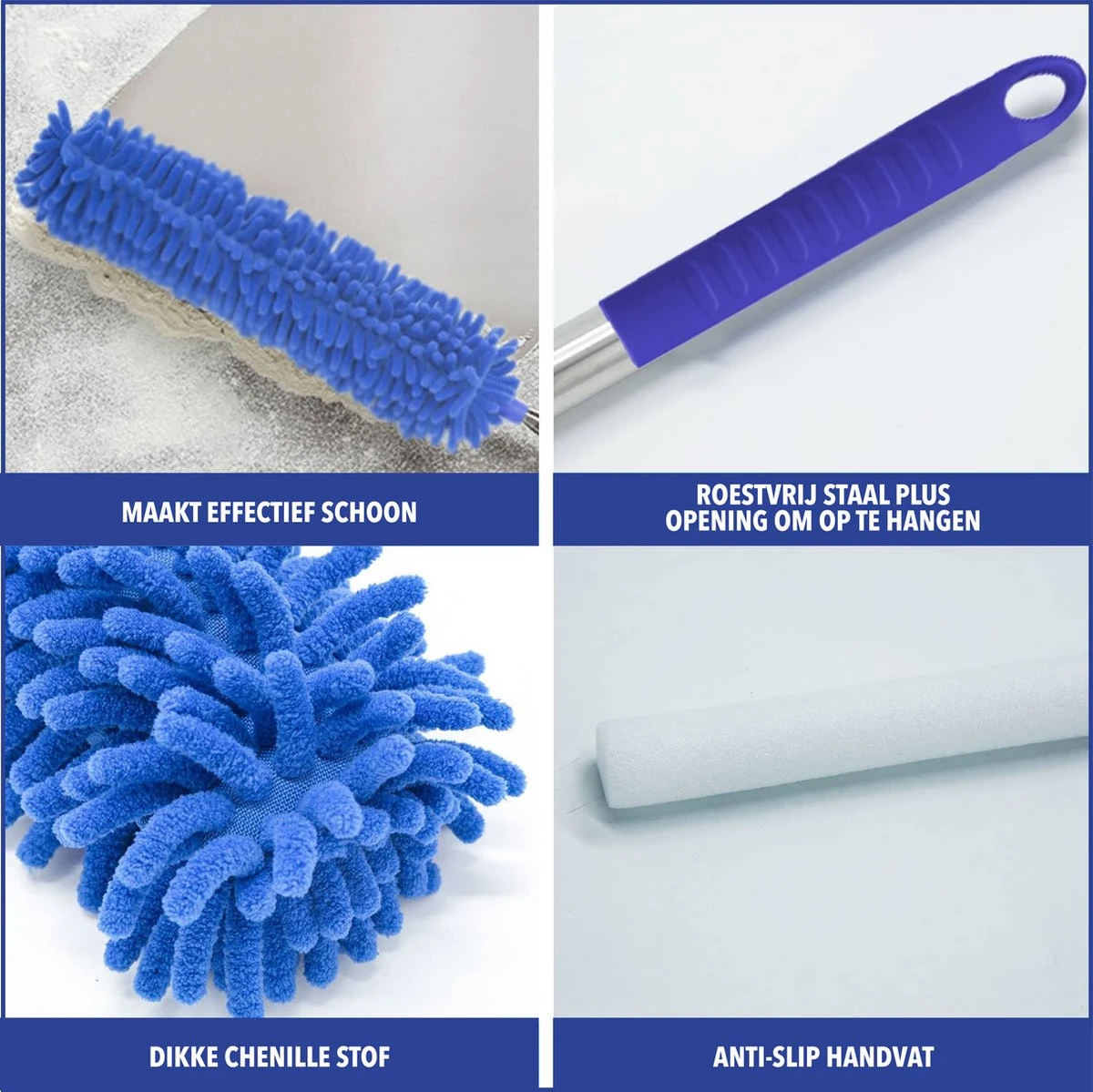 Schijnt de zon naar binnen en besef je ineens hoeveel stof er in je kamer ligt? Vooral wanneer je veel donkere meubels hebt kan dit een grote confrontatie zijn. Het afstoffen met vochtige doeken ben je inmiddels wel zat en je hebt moeite om op hoogte te komen. Dan is de Telescopische Plumeau een echte uitvinding voor jou. Je kiest gemakkelijk uit de 3 Verschillende Opzetstukken en stoft gemakkelijk het hele huis af. Je televisiescherm en het ventilatiesysteem … Met de Uitschuifbare Stang van Roestvrijstaal pak je alles mee. Deze is minimaal 39 cm lang, maar kan je uitschuiven tot wel 248 cm lang. Je hebt dus geen gevaarlijke ladder meer nodig. Of het nu tussen de kiertjes van de verwarming is of aan het plafond; met de Flexibele en Buigbare Telescopische Plumeau kom je overal bij.