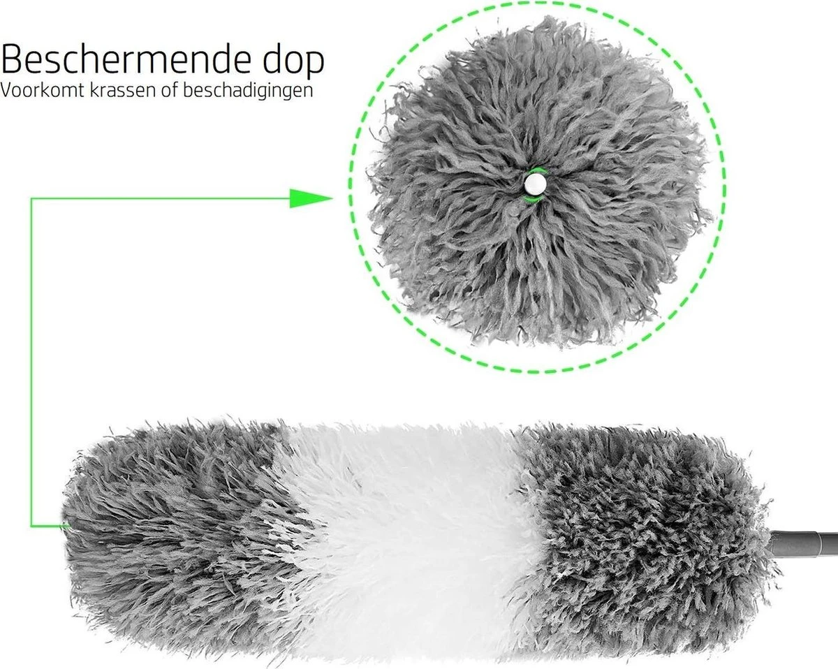 Met deze uitschuifbare en buigbare plumeau bereik je zelfs de lastigste en hoogste plekjes in huis. De stang is uitschuifbaar tot 2 meter 45 en de kop van de plumeau kun je in allerlei bochten buigen zodat je zelfs bovenop de hoogste kast of in de nok van je huis kunt stoffen. De plumeau vangt het stof op en deze kun je gemakkelijk uitspoelen onder de kraan!